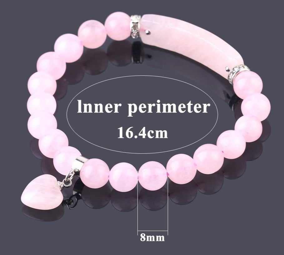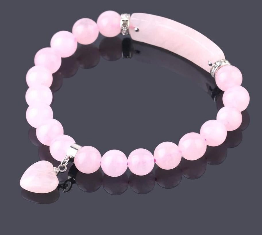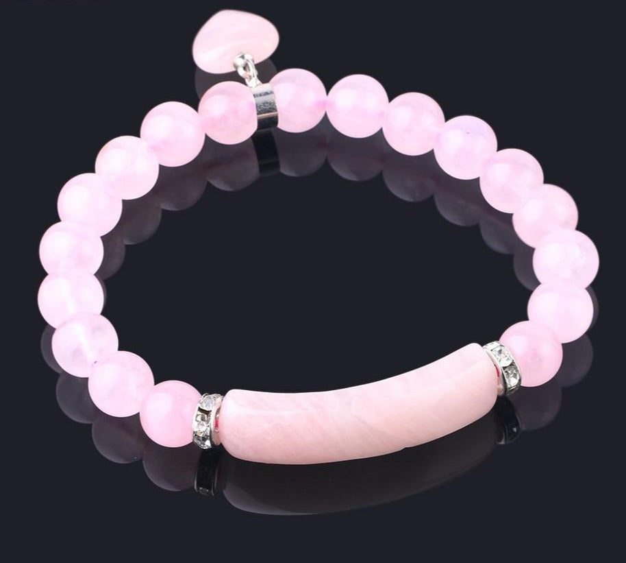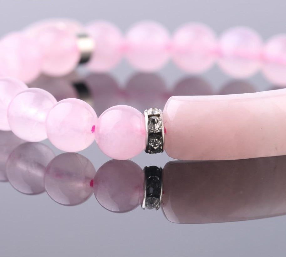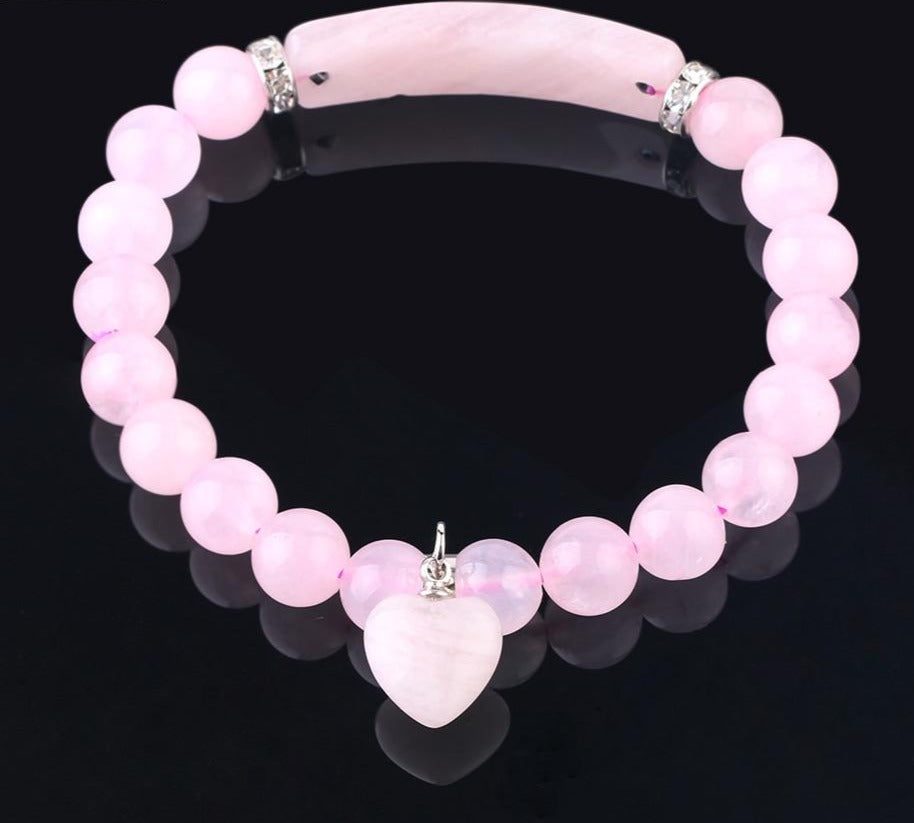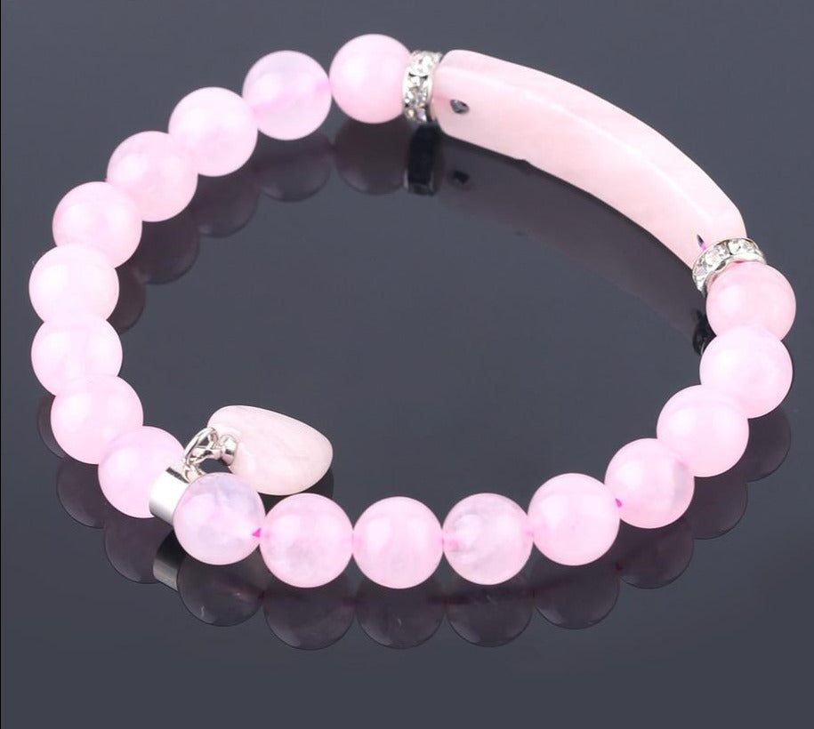 Rose Quartz eases guilt and balances emotions, lowering stress and bringing peace. Wear the Love Vibration Rose Quartz Bracelet to enhance positive self-affirmations.