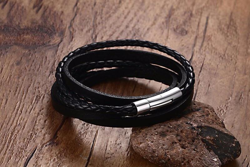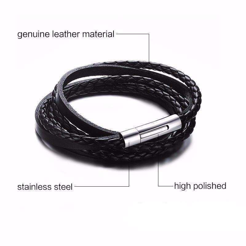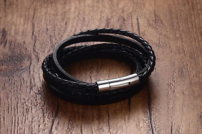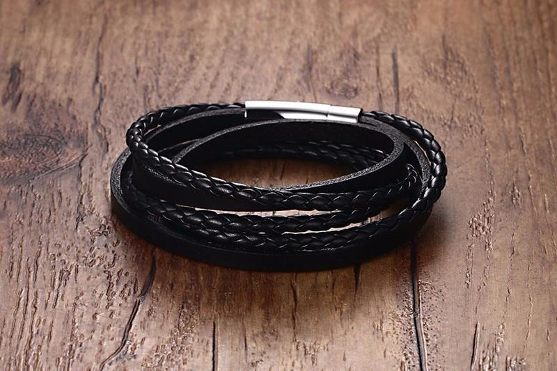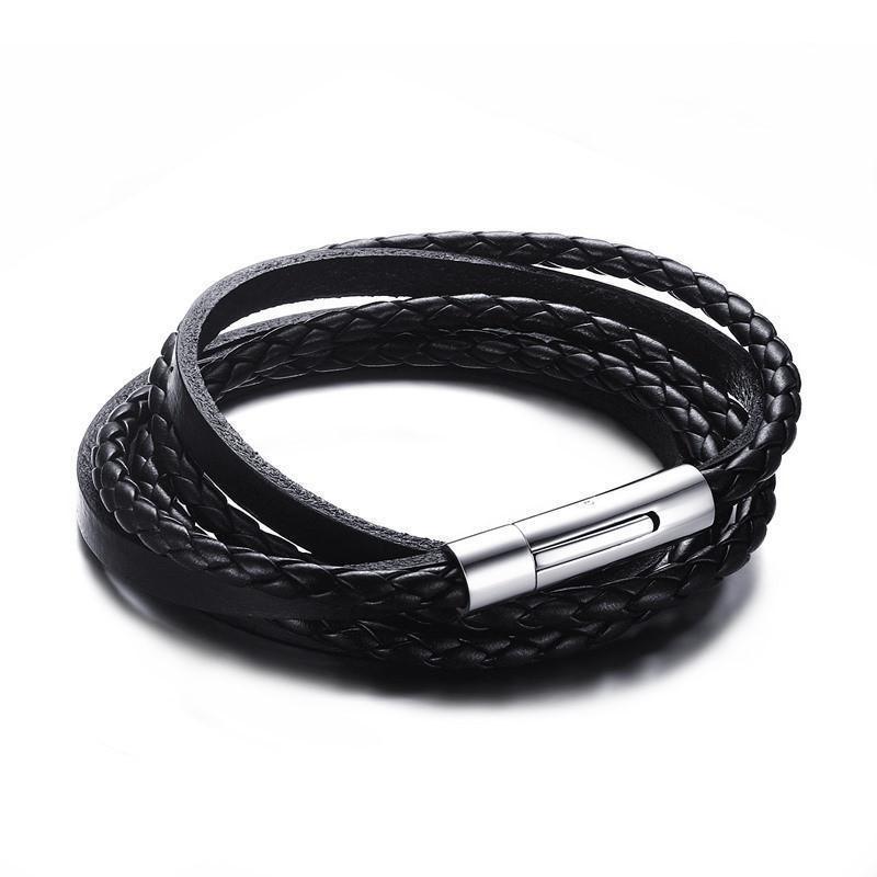 Multiwrap Genuine Black Leather Stainless Steel Bracelet