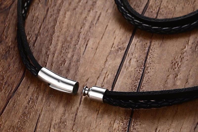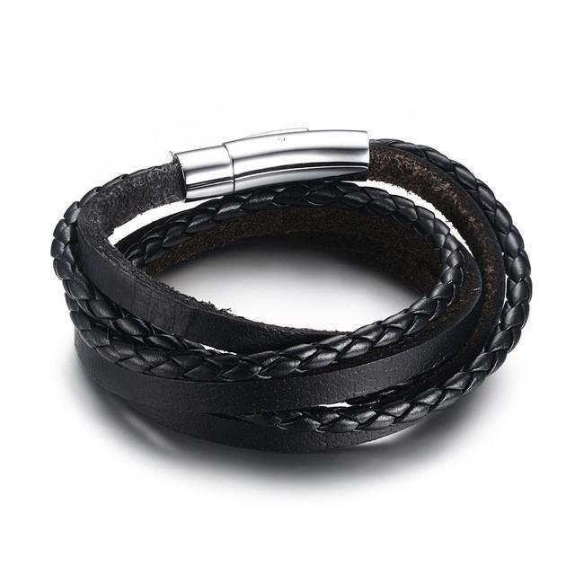 This bracelet uses 2 long ropes of Genuine Black Leather held securely together by a silver toned cylindrical magnetic clasp. The 2 leather ropes are a combination of a raw flat cut and a circular weave style. It creates an illusion of the highly popular style called Layering where wearing several bracelets at once is done.