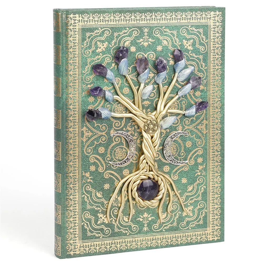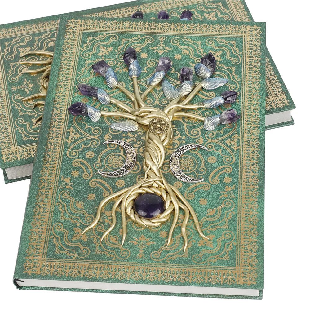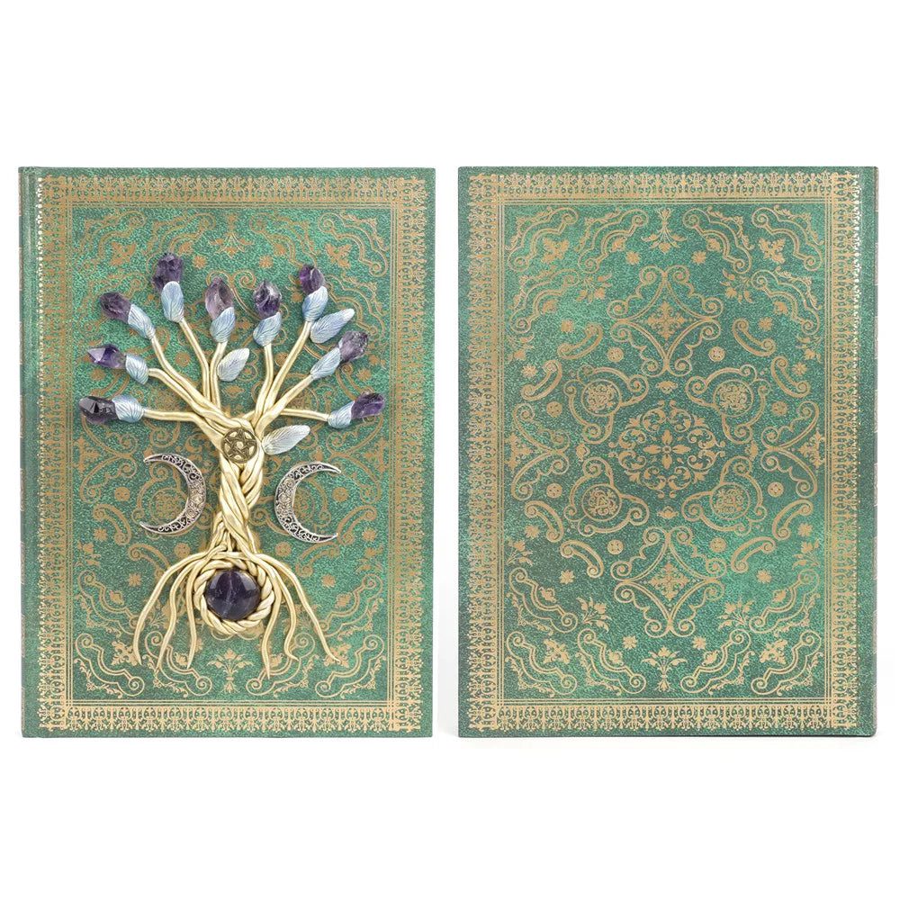 This journal contains 100-120 pages and features Amethyst gemstones on the cover page. Amethyst is used to help open and clear the mind. It promotes creativity and writing by inviting inspiration.