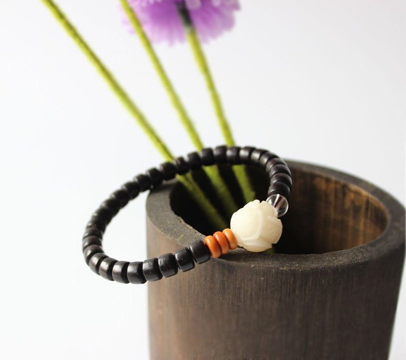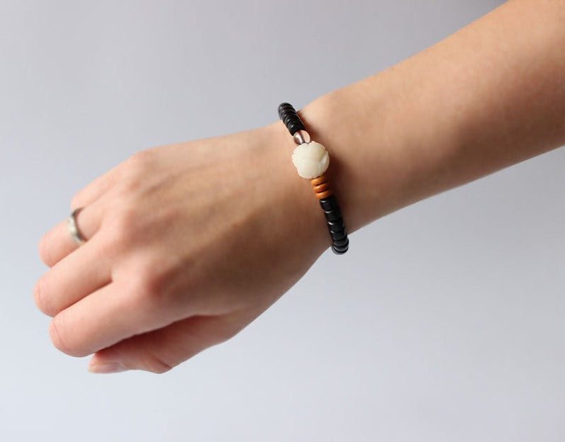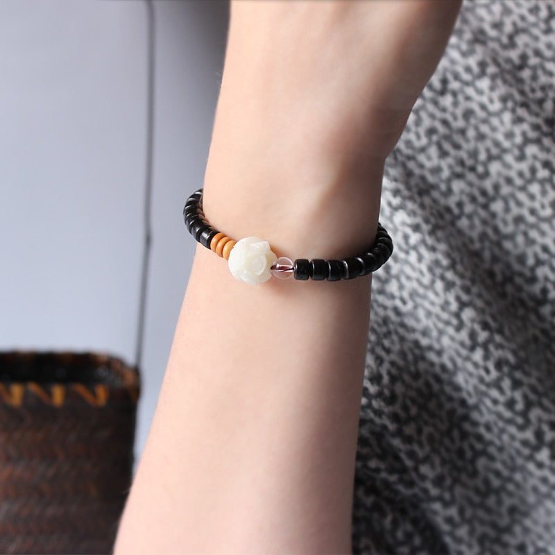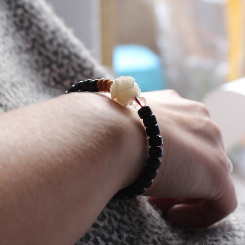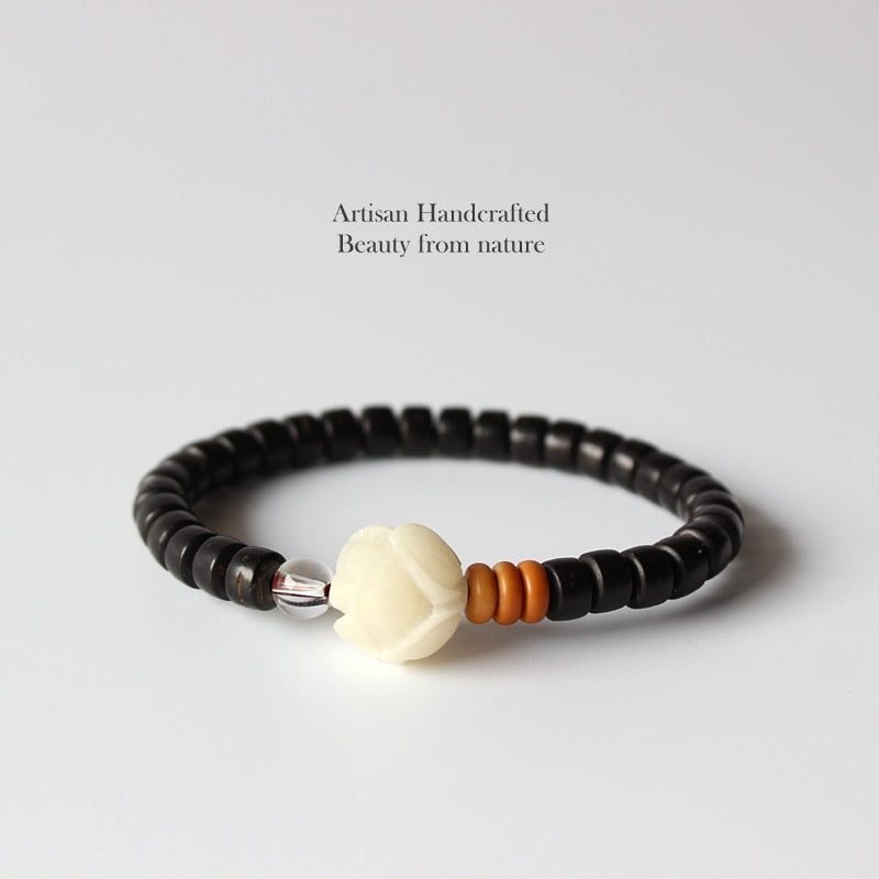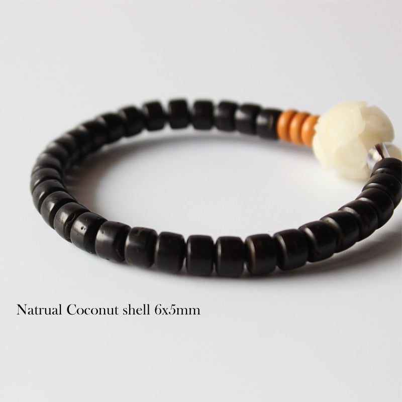 The Six True Words, or the Six Syllable Mantra, is one of the most well-known verses in the world and is exquisitely carved on each of the natural coconut shell beads to make it very meaningful. It is used to purify certain areas in a person such as pride, jealousy, desire, ignorance/prejudice, greed, and hatred. It focuses on the progression of: