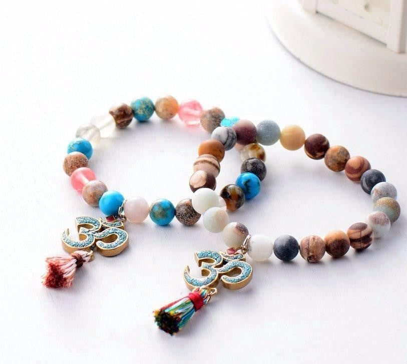 This Natural Jasper Beads with Tibetan OM Charm and Short Tassel Mala Bracelet is handmade with Natural Jasper Beads...