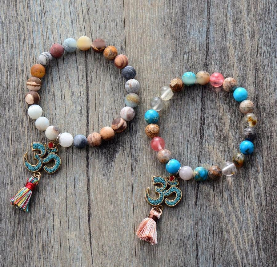 Natural Jasper Beads with Tibetan OM Charm and Short Tassel Mala Bracelet