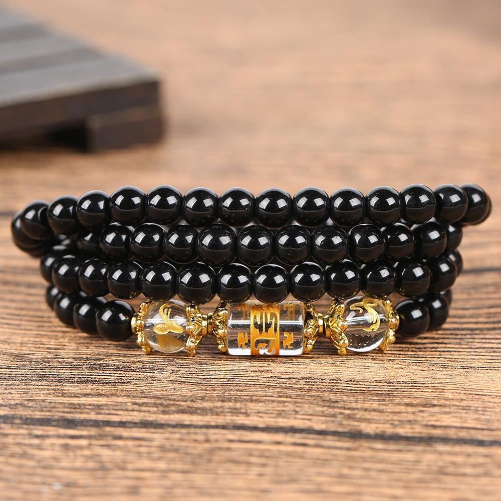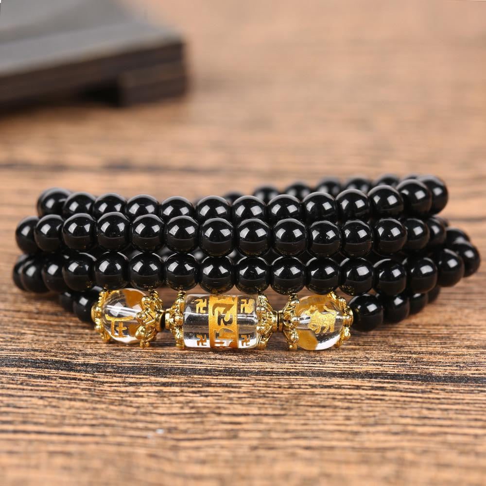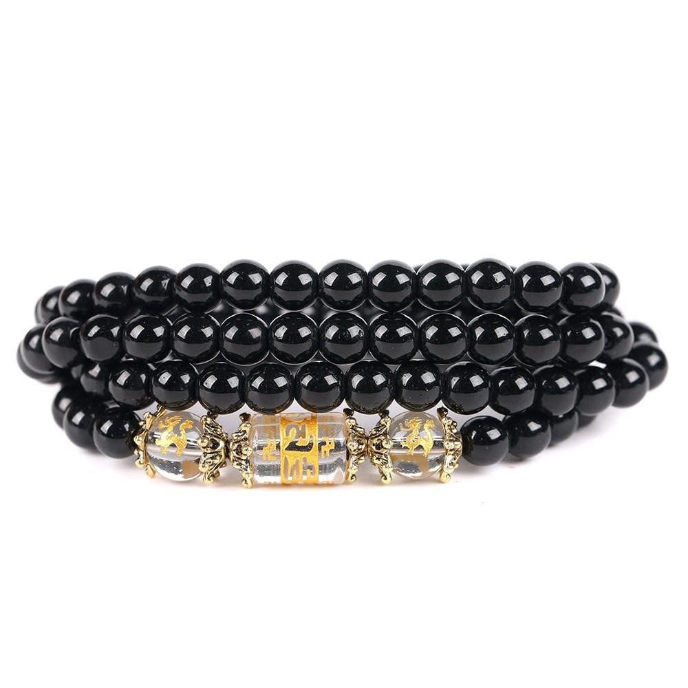 The traditional six-word mantra engraved on the crystal focal bead makes it very meaningful. It is used to purify in a person centers of pride, jealousy, desire, ignorance/prejudice, greed, and hatred. It focuses on the progression of: