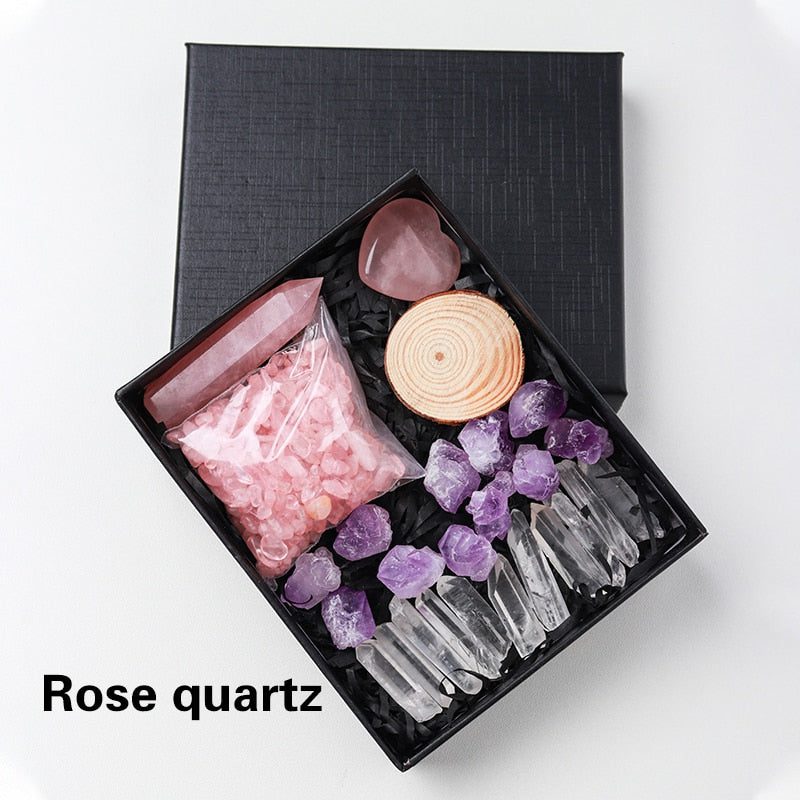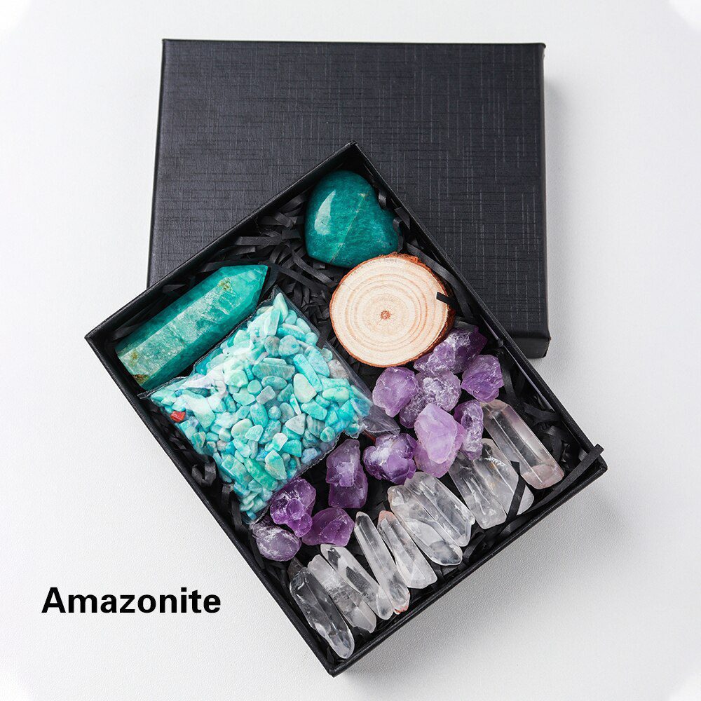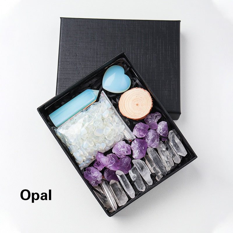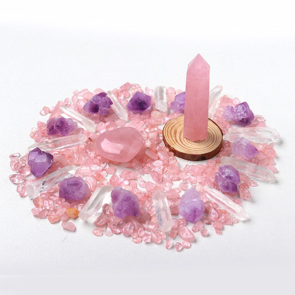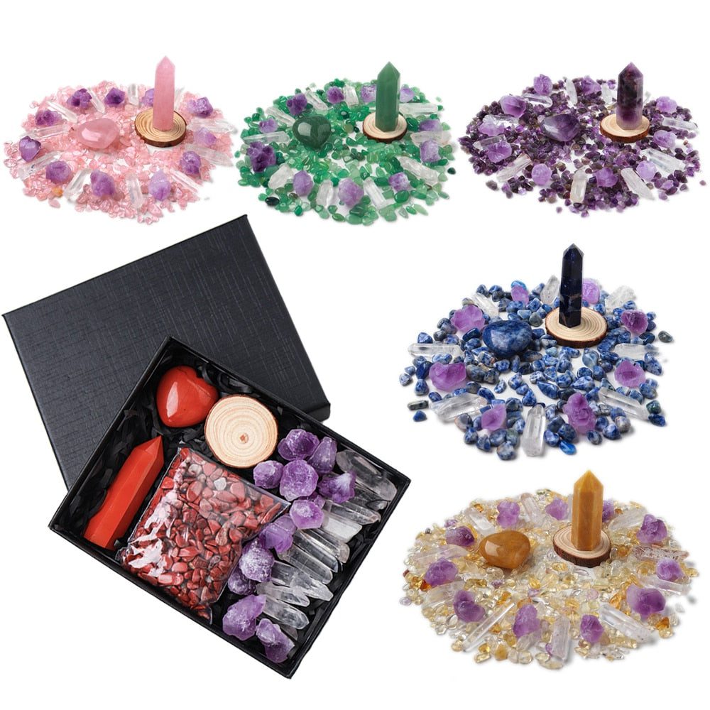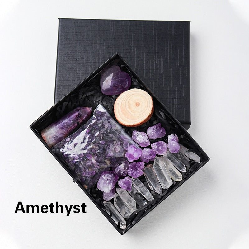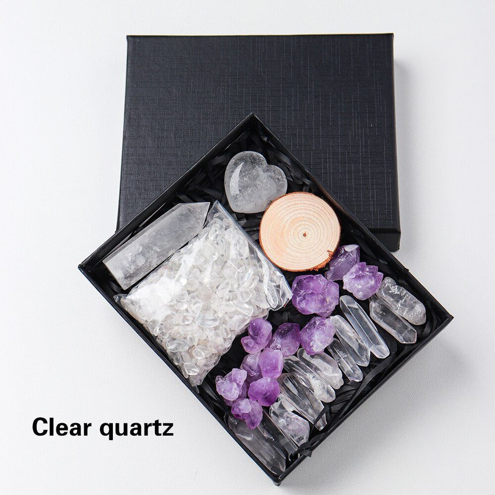 A Crystal Point or Wand, a Heart Stone, a bag of crystal gravel, an Amethyst Tooth, and 11 pieces of Clear Quartz are included in each set. You can also choose the main stones for your collection by looking through the available materials. Remember to choose the stone that best represents your intention or the person you intend to gift it to.