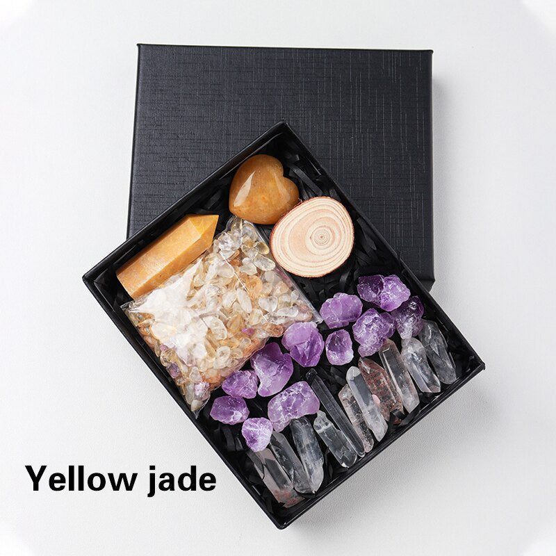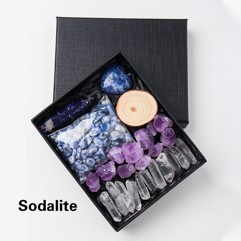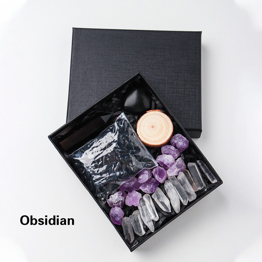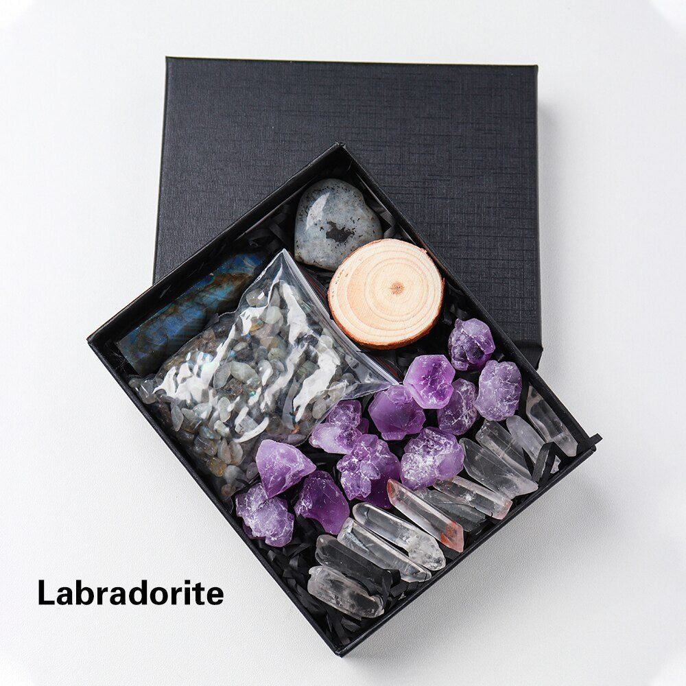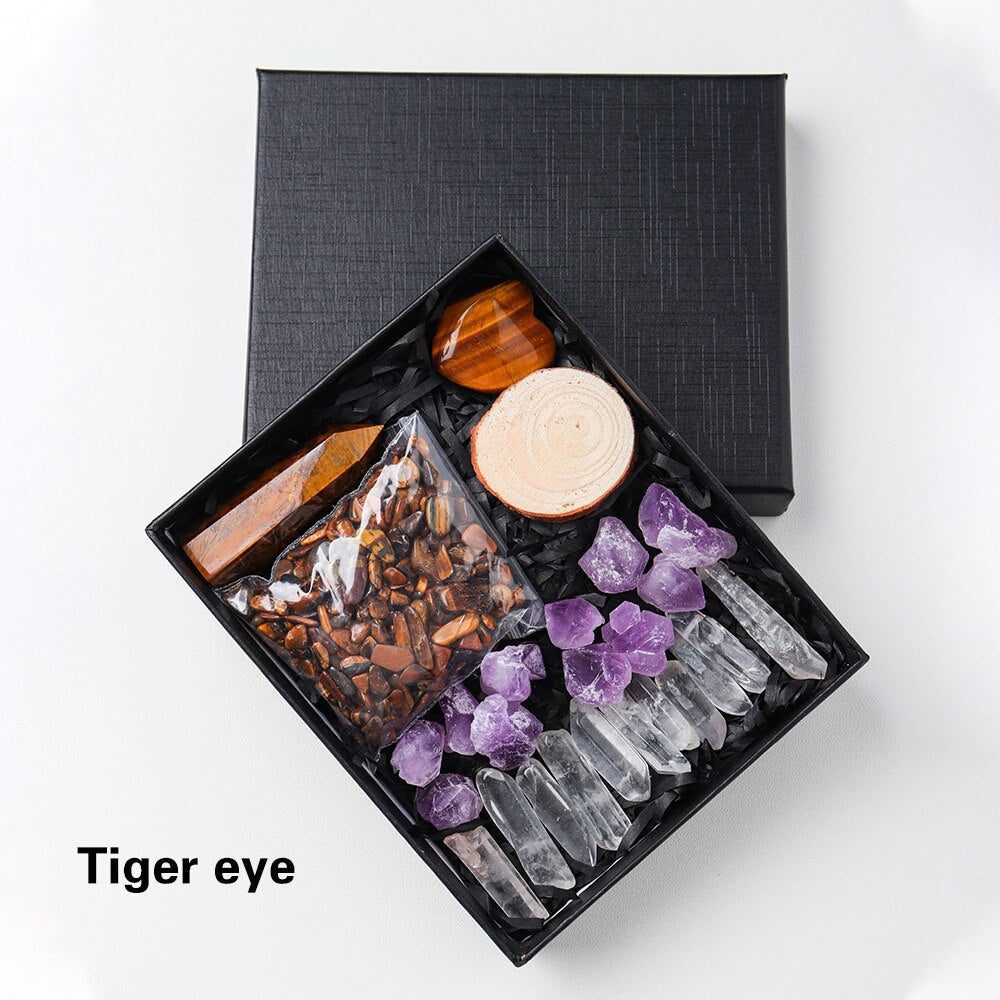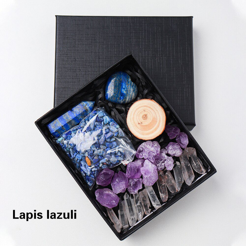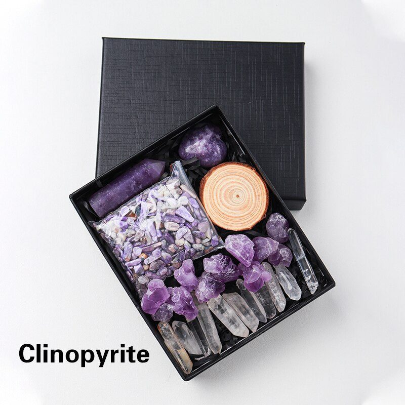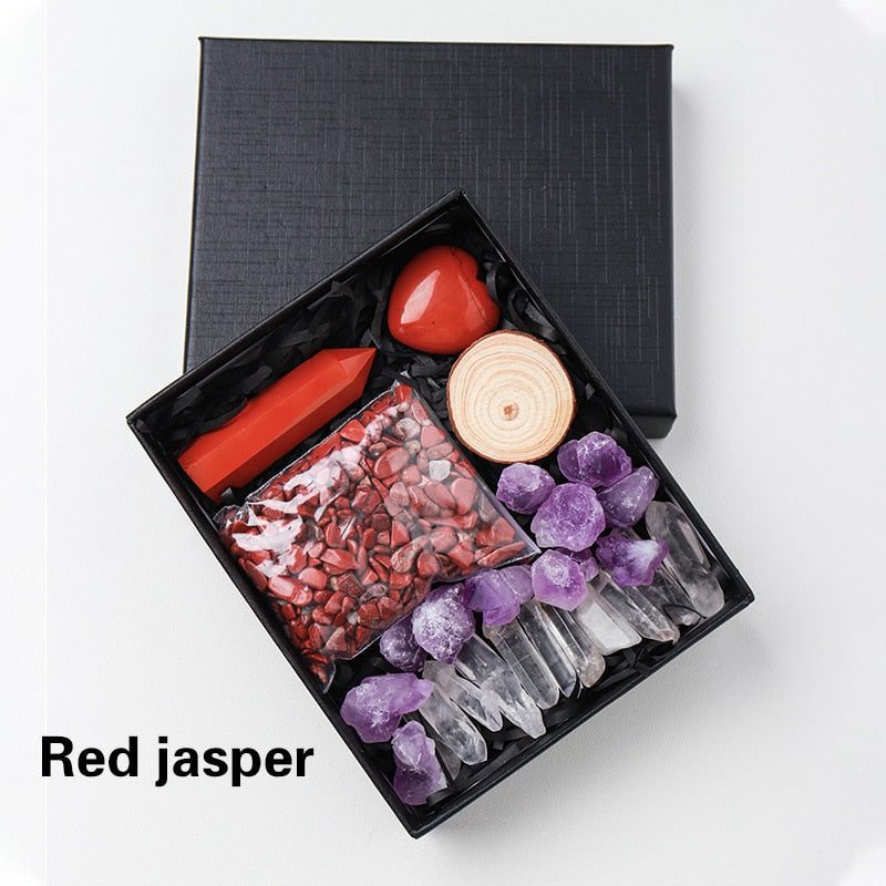 A Crystal Point or Wand, a Heart Stone, a bag of crystal gravel, an Amethyst Tooth, and 11 pieces of Clear Quartz are included in each set. You can also choose the main stones for your collection by looking through the available materials. Remember to choose the stone that best represents your intention or the person you intend to gift it to.