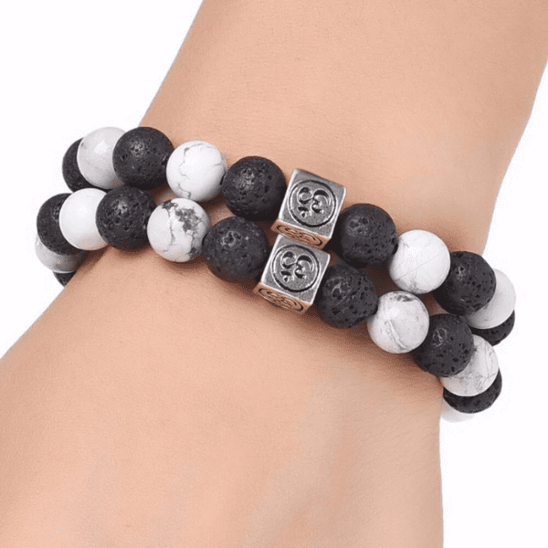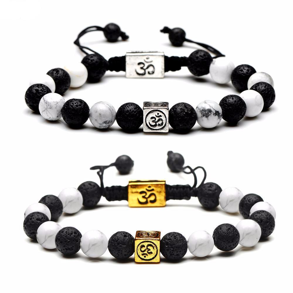 This bracelet is made with natural stone beads of Howlite and Lava Rock handpicked by experts to ensure the highest quality of this product and paired with a beautiful om charm. Exquisitely crafted to form one of the most well known symbols in the world, this symbolic piece features a silver or gold tone cube charm engraved on 4 sides and tinted with black to bring out the design of the Om symbol.