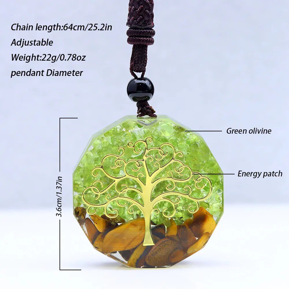 The pendant is made of Green Olivine, a powerful tool for emotional release and a valuable stone for those working to heal old emotional wounds. Energy Patch is also included to unblock and channel energies while removing negativity. In addition, Tiger Eye Beads, which have healing properties that can help you feel happy and calm, were added to complement the orgone pendant.