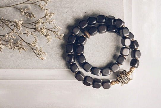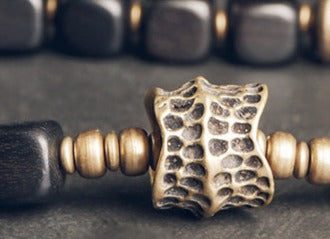 This bracelet showcases a row of rich dark ebony wood, and lava stones accented with incomparable charms. You can choose either the lucky Dzi bead charm or the hand-hammered brass charm. They are strung on a cord that won't break, or loosen up, yet will slide onto your wrist easily.