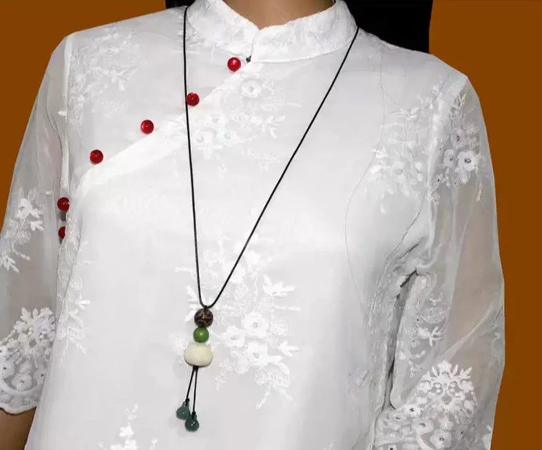 This beautiful necklace is made with natural white bodhi seeds, green aventurine, and brown bodhi seeds. The seeds are strung on a rope necklace that is about 75cm in circumference. The necklace also features a tassel at the end.