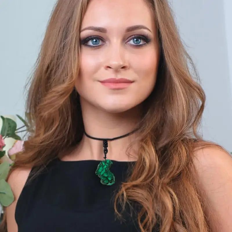The necklace is made by rough stone polishing, resulting in an opaque transparency with light to dark green striations within these beautiful pendants measuring approximately 0.8in-1.57in.