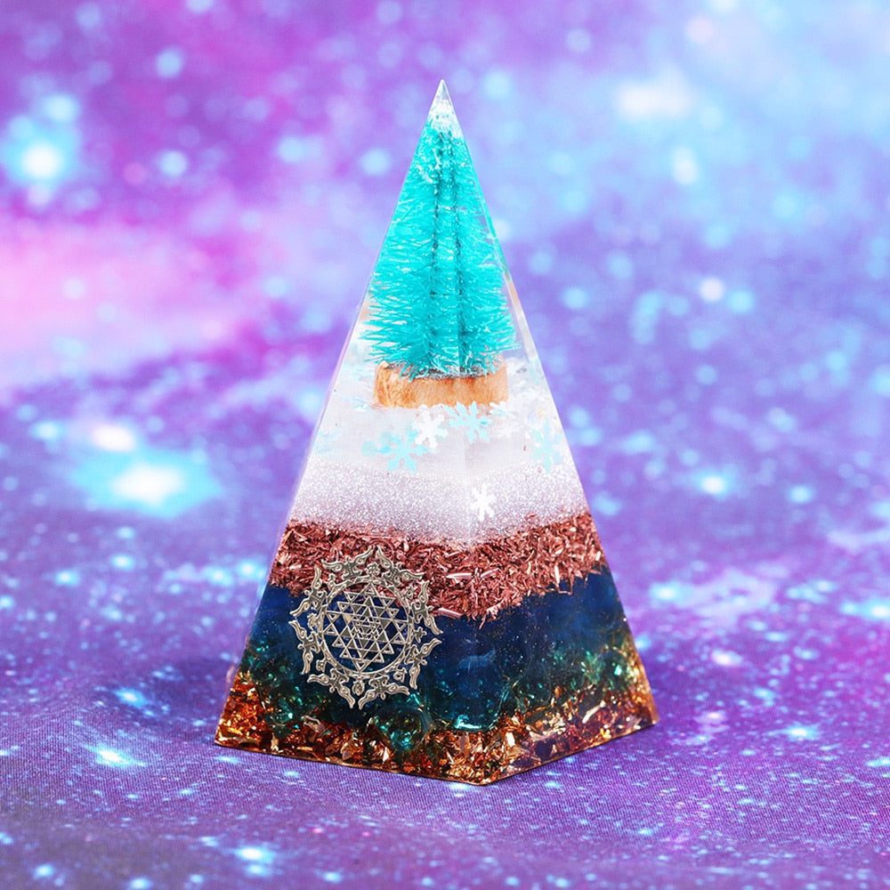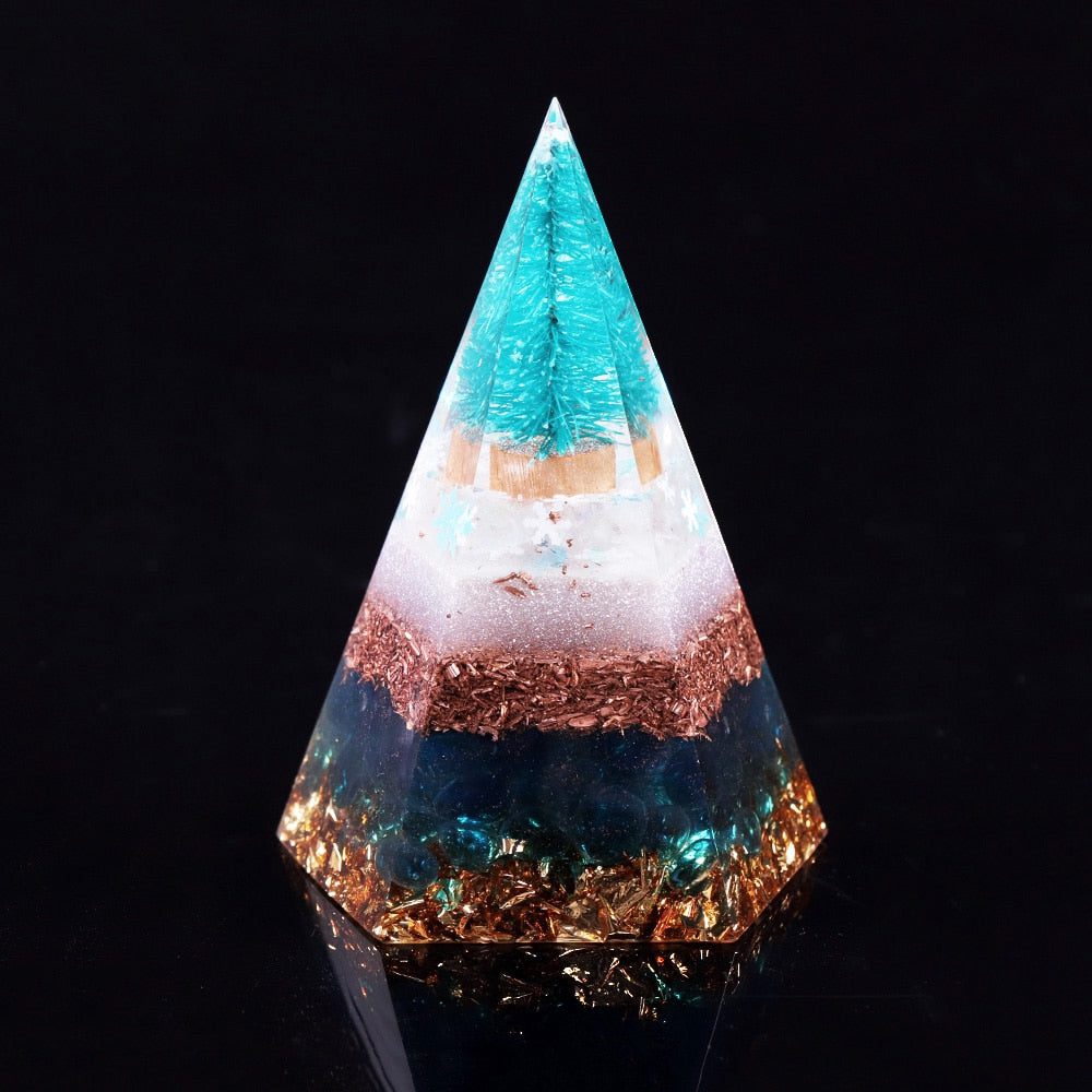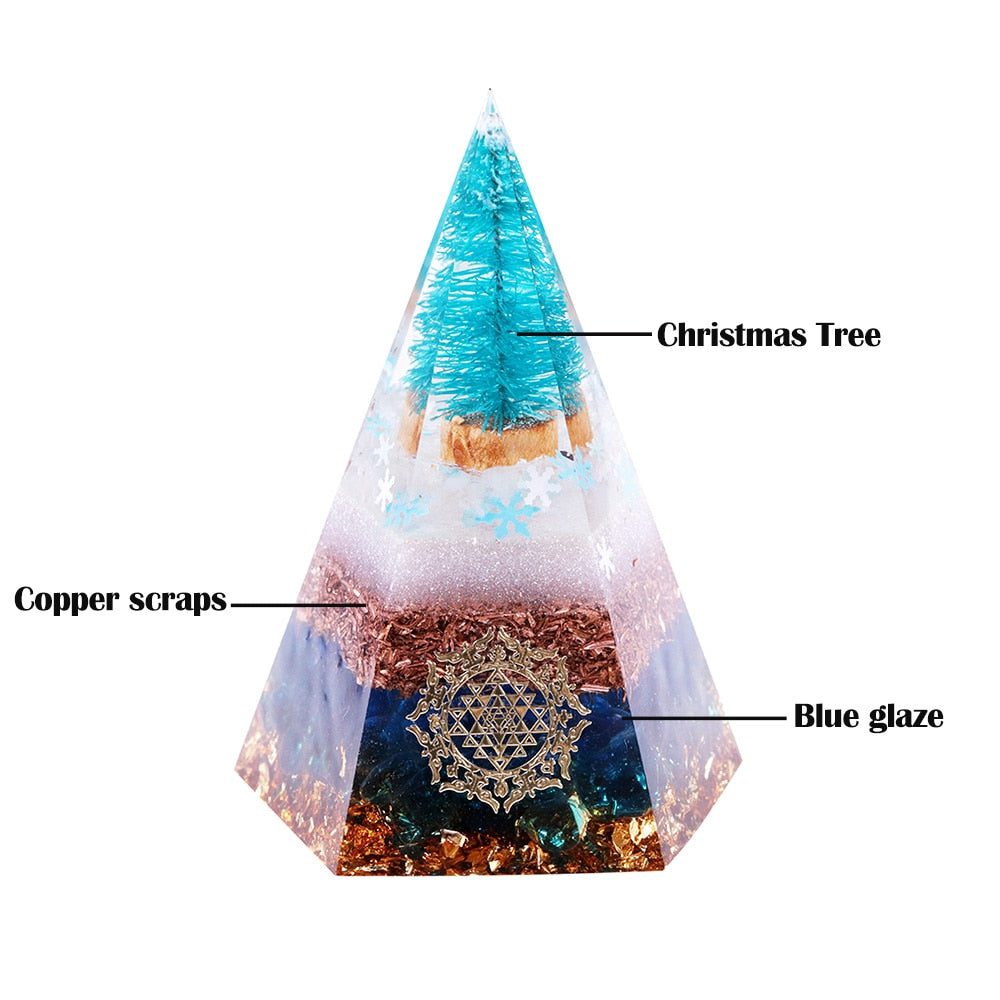 Feel the Christmas vibes with this Orgone Pyramid. This pyramid consists of a cool blue gaze stone, dazzling copper scraps, and a little Christmas tree to complete the design.
