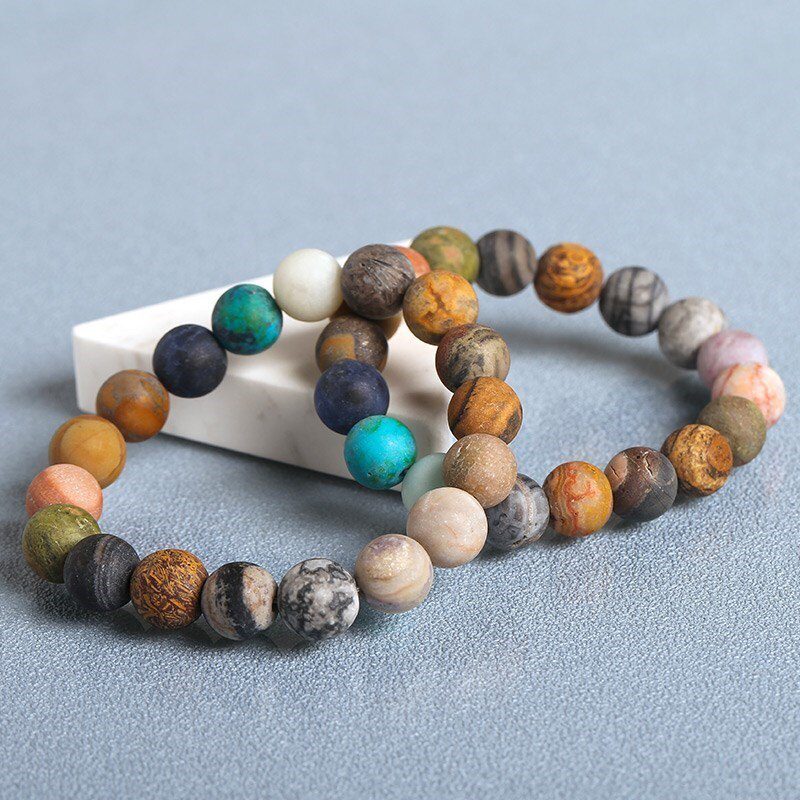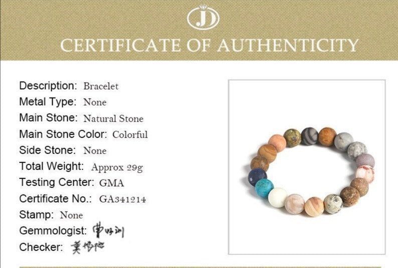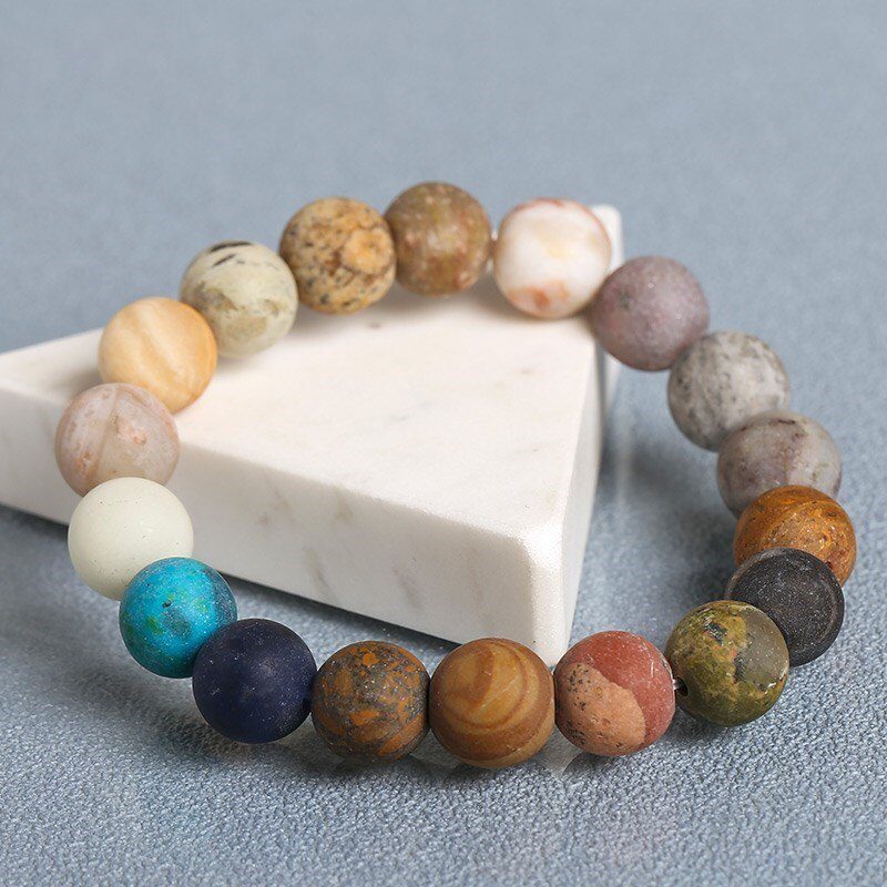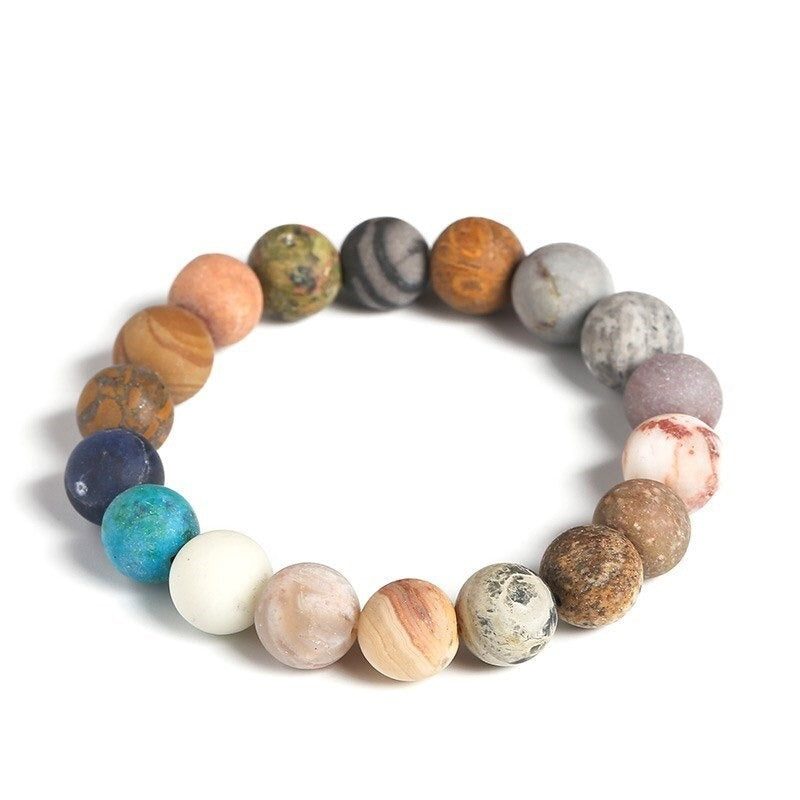 This astronomical bracelet represents human nature's interdependence with the universe; it was inspired by our Solar System and was made from carefully selected natural stones mined from the earth that bear striking resemblances to the actual planets, moon, and sun.