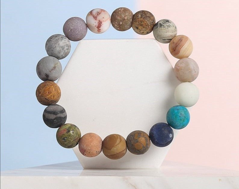 These different stones represent the planets of the solar system, reminding us to embrace change and/or uncomfortable feelings on our journey to new beginnings because there is always a rebirth of new life and an end to negative energies. This bracelet can help us regain a sense of balance in our lives and in our environment by providing a direct connection back to Mother Earth.