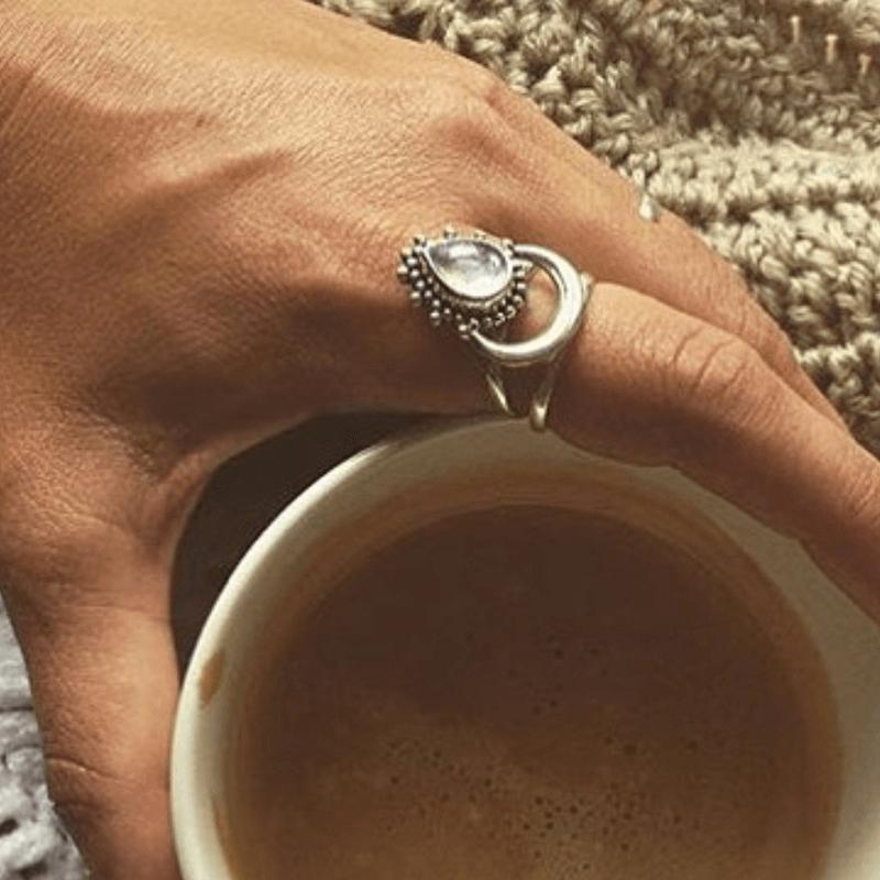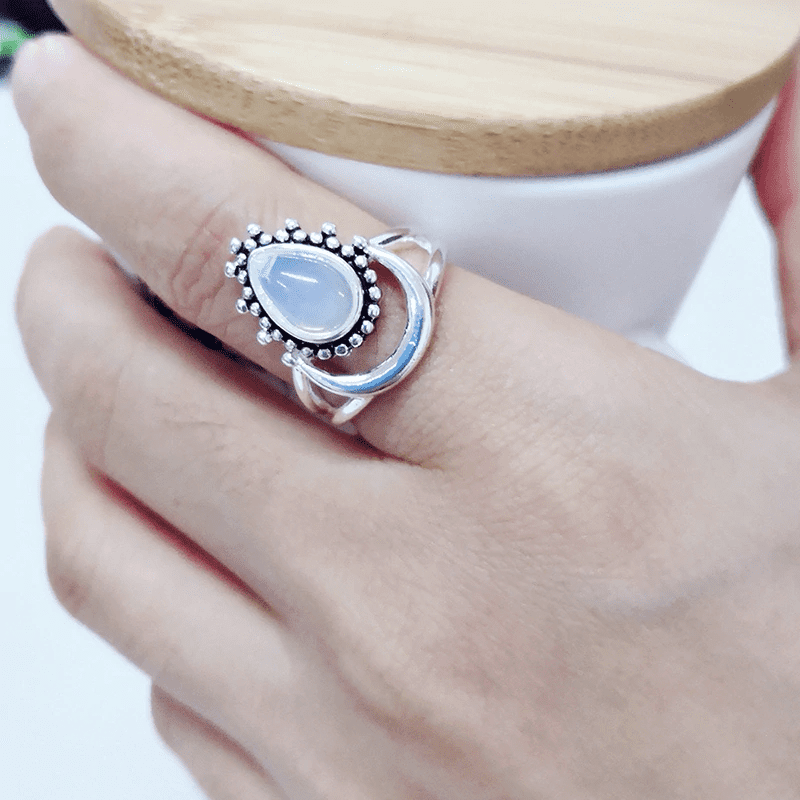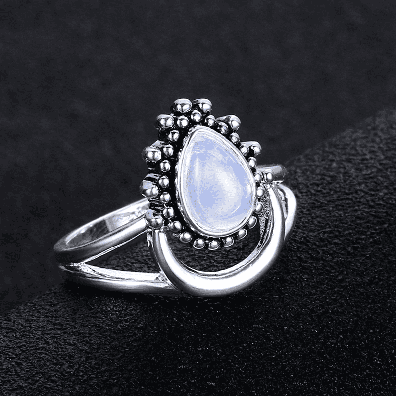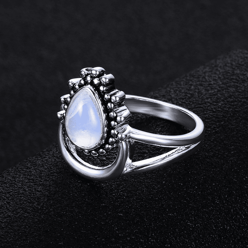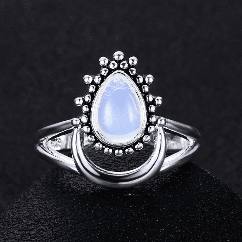 This beautiful Spiritual Growth Ring features a tear drop shaped moonstone nestled in a dewdrop-like setting upon a crescent moon. The unique design is symbolic on its own portraying dewdrops forming in the last hours of the moonlight in a cloudless sky, ready to enter the beginning of a new day.