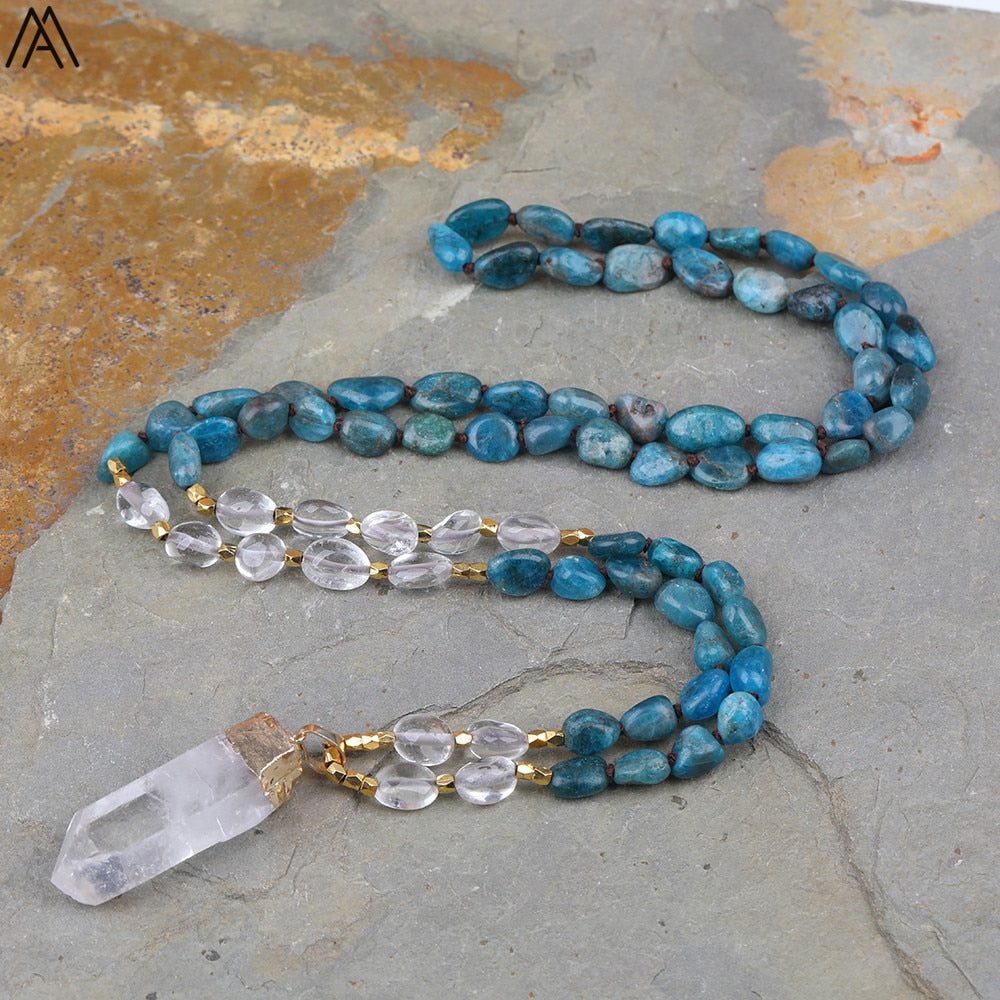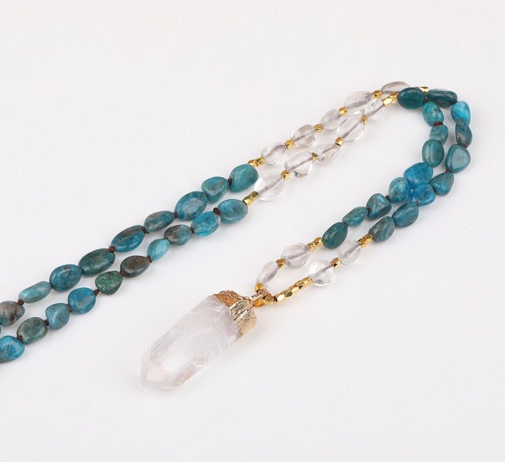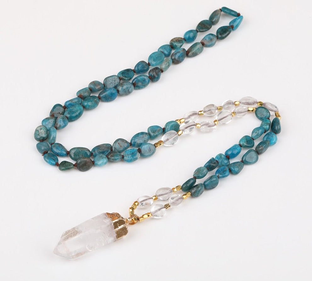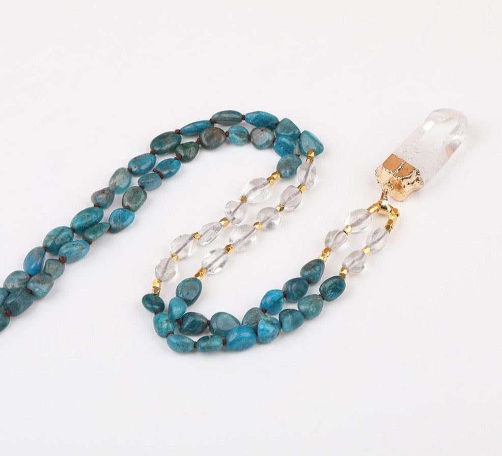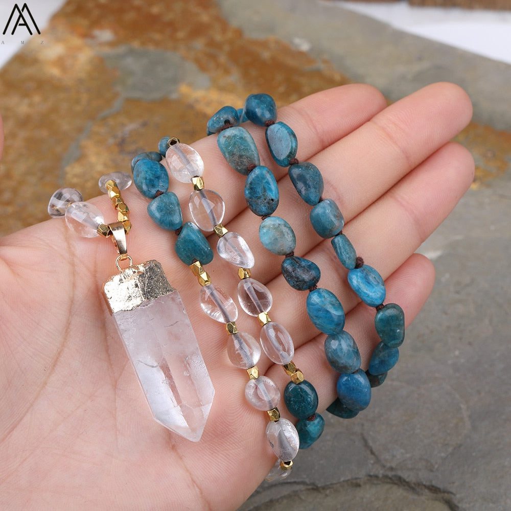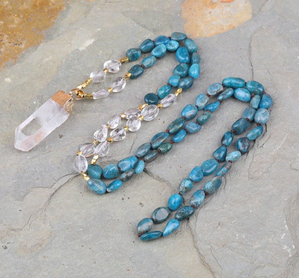 Looking for a special necklace to add some bling to your wardrobe? Check out this handmade blue apatite nugget chip necklace! This bead is made from natural gemstones and comes with a pretty white quartz point bead dangling from it for extra sparkle!