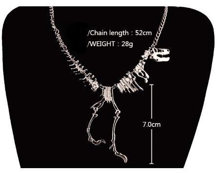 Relive the jurassic adventure with this T-Rex Skeleton Necklace! Modeled like freshly dug out bones, this fossil is crafted using high quality metal alloy made to last. With choices of either a nice luster piece or a purposely oxidized piece that adds a nice touch of aging to this unique necklace.