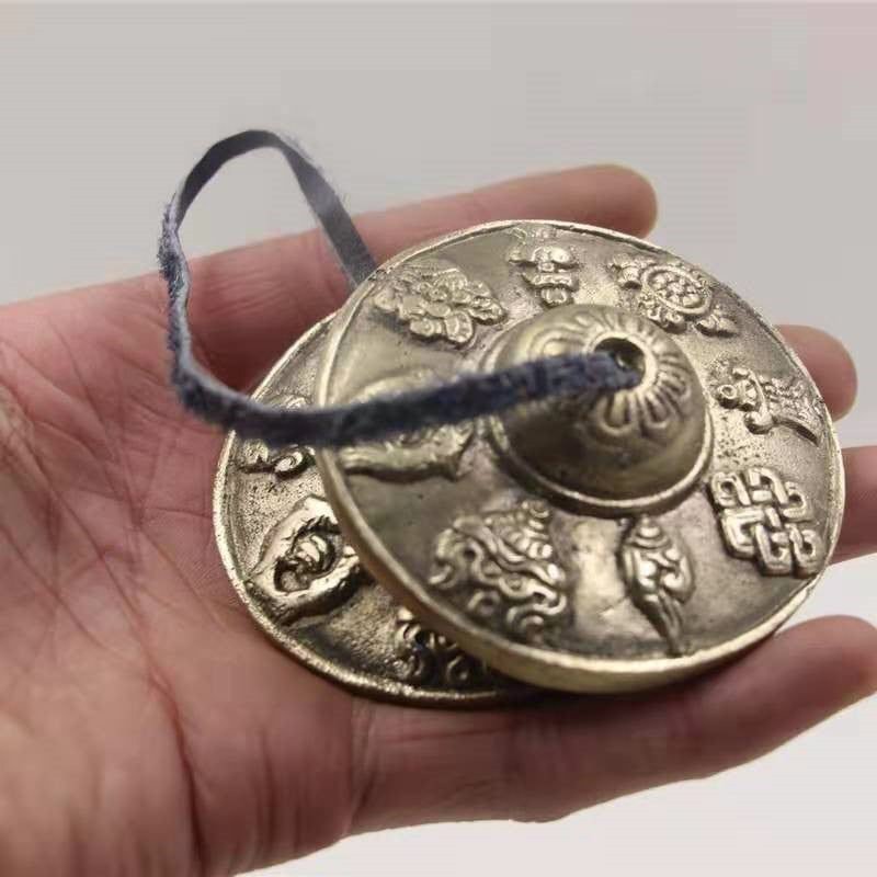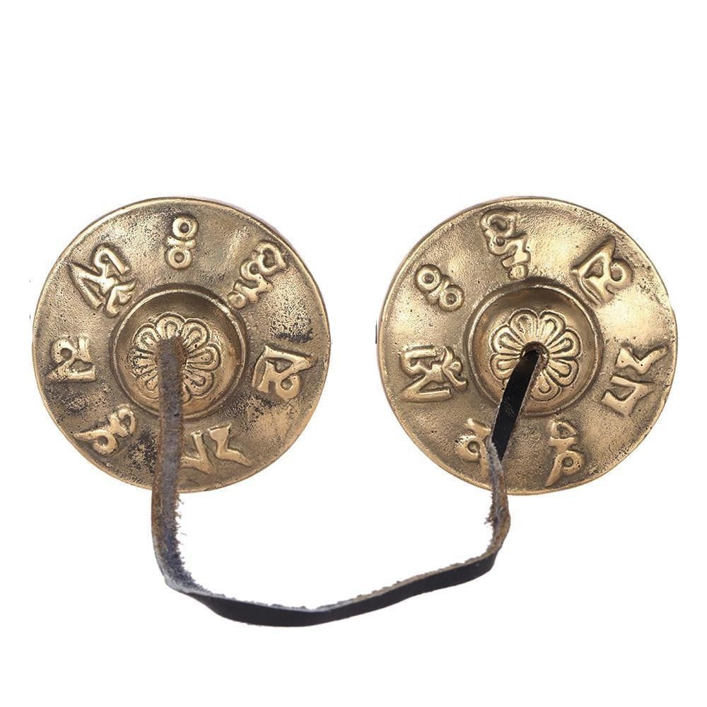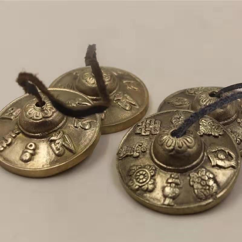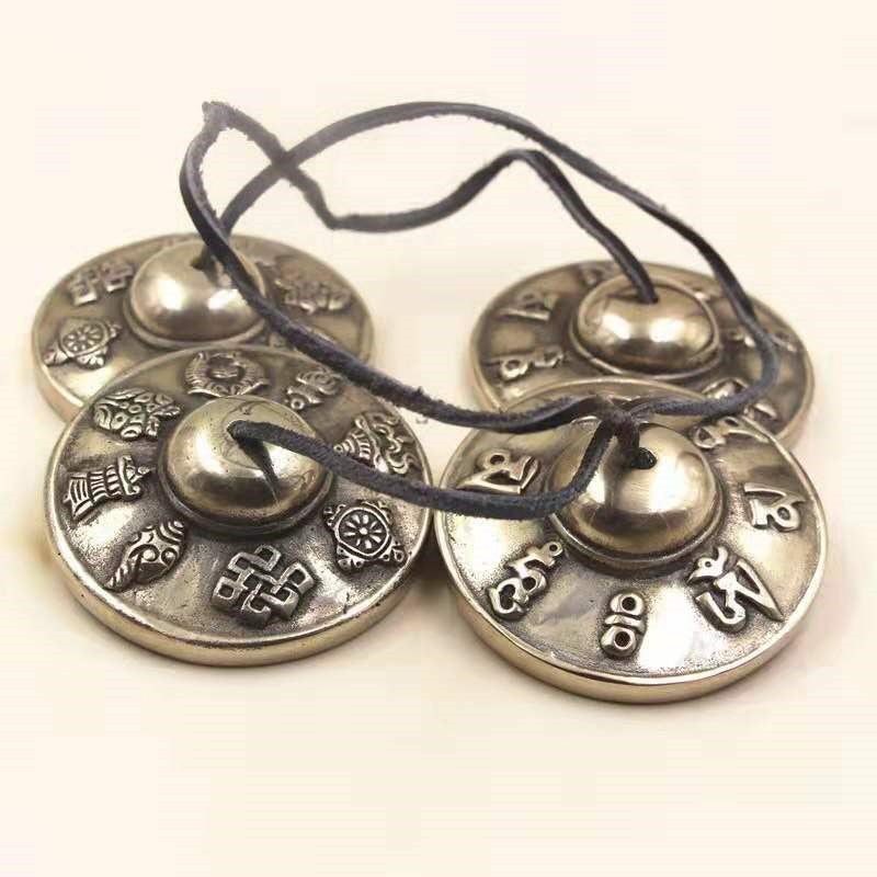 Tibetan Tingshas are small Prayer Chimes used by Tibetan Buddhist Monks, Yoga Teachers, Holistic Health Practitioners, and Meditation Groups. They are traditionally used for ceremonial functions throughout the Himalayan regions of Nepal, Tibet, India and, Bhutan They are often used to start and end a Meditation, Yoga Class, or simply for Space Clearing to remove negative energy around you. They come in matched pair, held together by a leather cord. It can be played by tapping the rims together or by clapping them together like cymbals. Tingshas have varying emblems and symbols embossed on the outside.