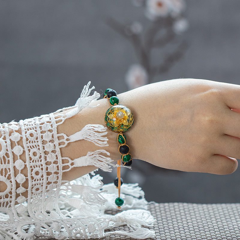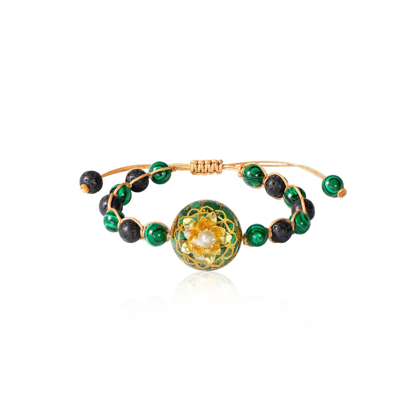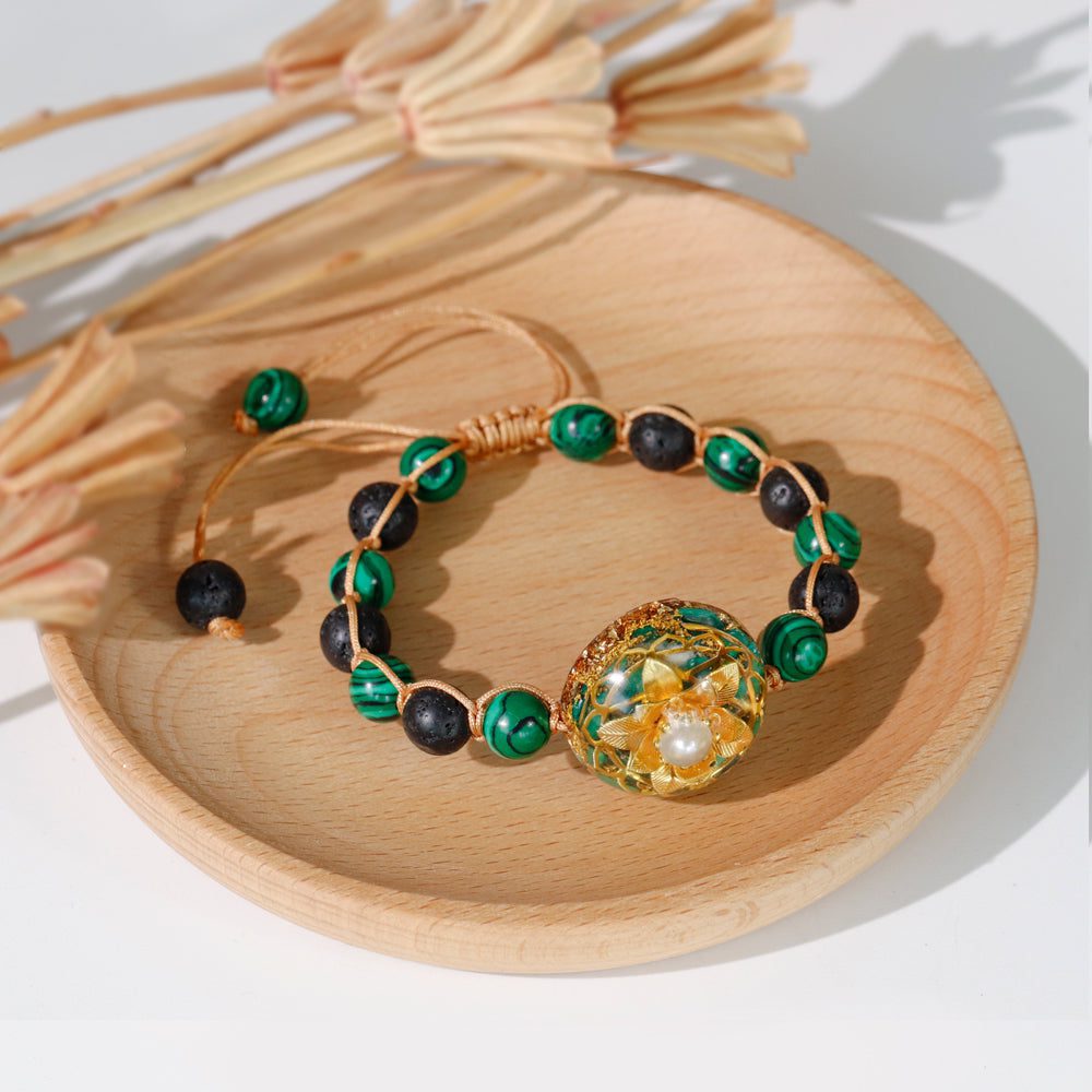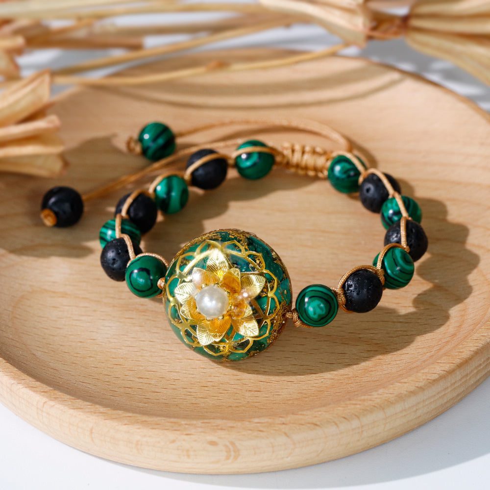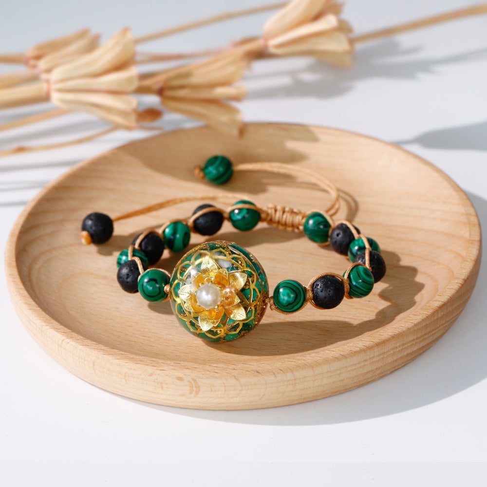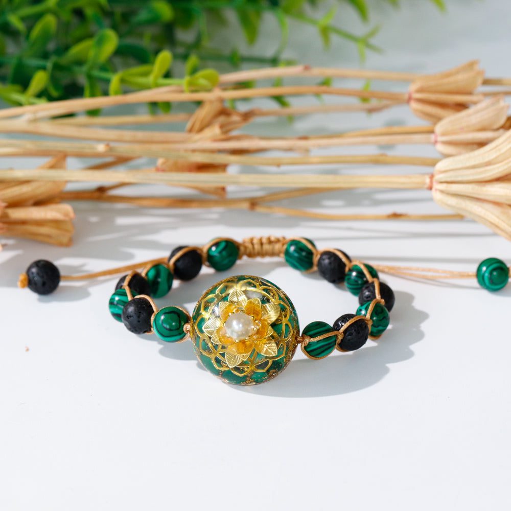 Materials:Malachite, Gold Foil, Copper, Glass Beads, Malachite, Volcanic Stone Beads, Epoxy Resin