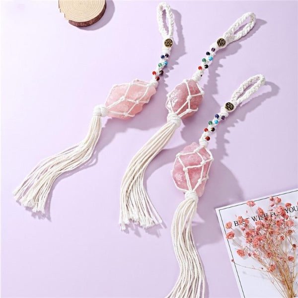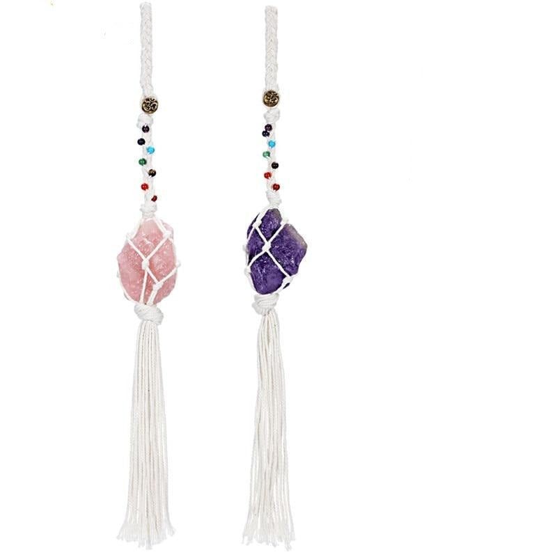 These precious raw crystals are at the heart of this tassel, radiating their distinct and potent energies. Rose Quartz, renowned as the stone of love and compassion, emanates a gentle, comforting aura that fosters harmony and emotional healing. Amethyst, celebrated for its calming properties, enhances spiritual awareness and inner serenity.