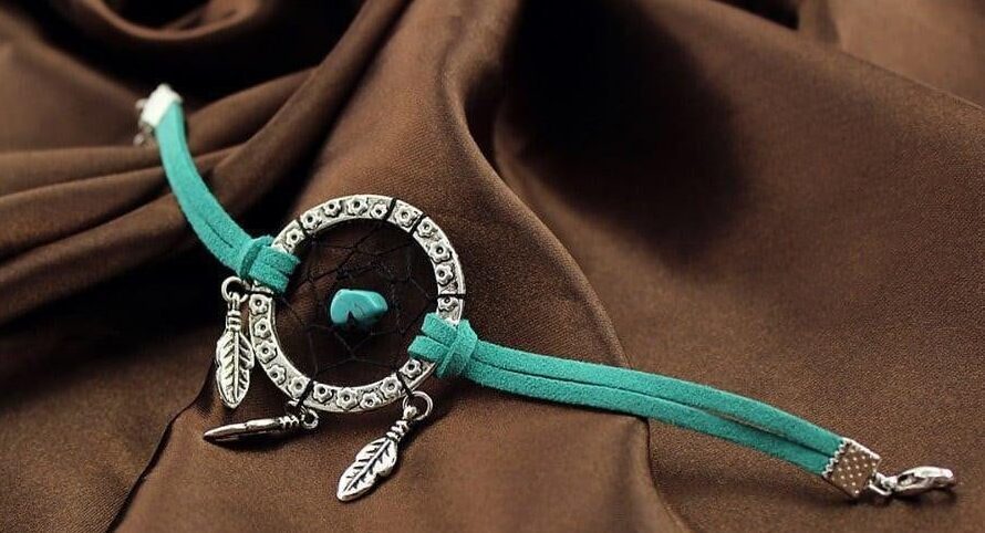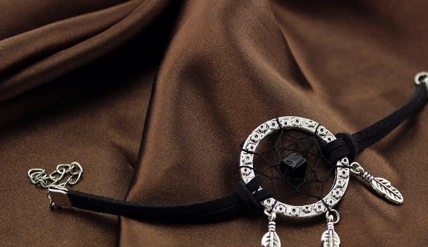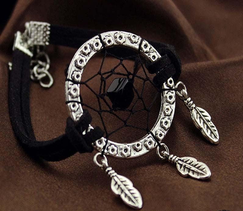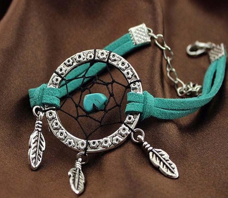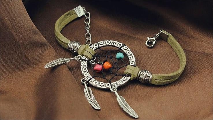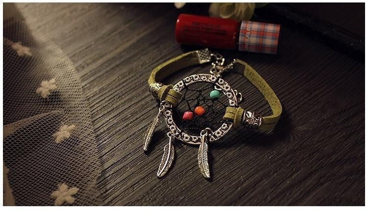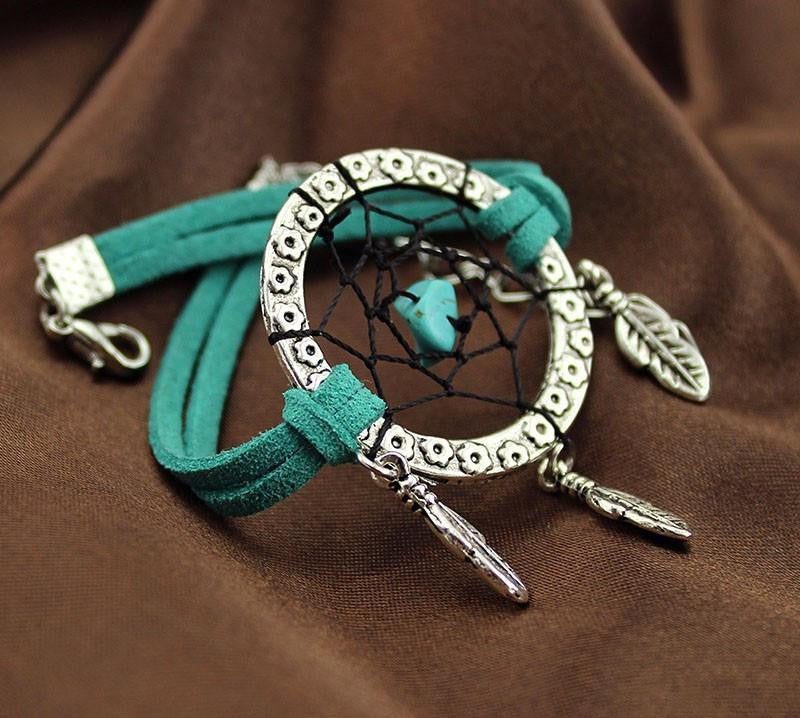 This unique bracelet features a flower embossed silver ring with silver feather dangling charms. Colored beads are entangled at the heart of the dream catcher with beautiful antique silver bead accents stringed through two leather strips on each side secured by a lobster clasp.