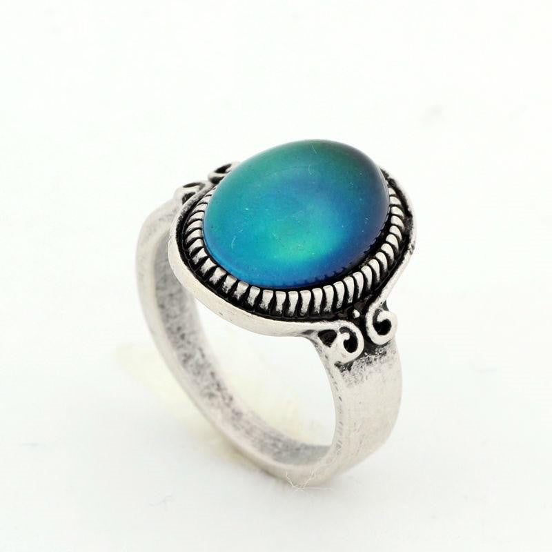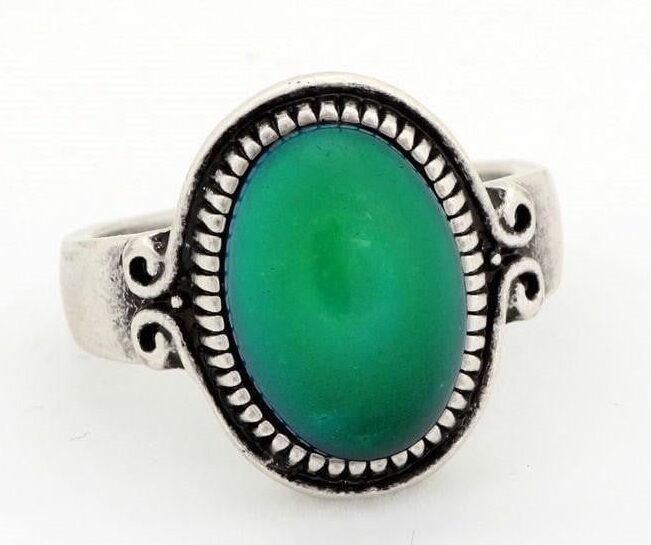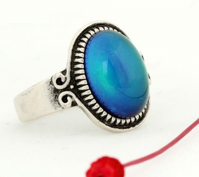 The Vintage Glass Mood Ring has a thermotropic liquid crystal within its center working with your body temperature. As you exhibit a certain emotion or mood, your body releases an increased flow of blood to its specific regions producing a cool or warm skin surface. The thermotropic liquid crystal reacts to the change of body temperature manifesting a color that represents your mood.