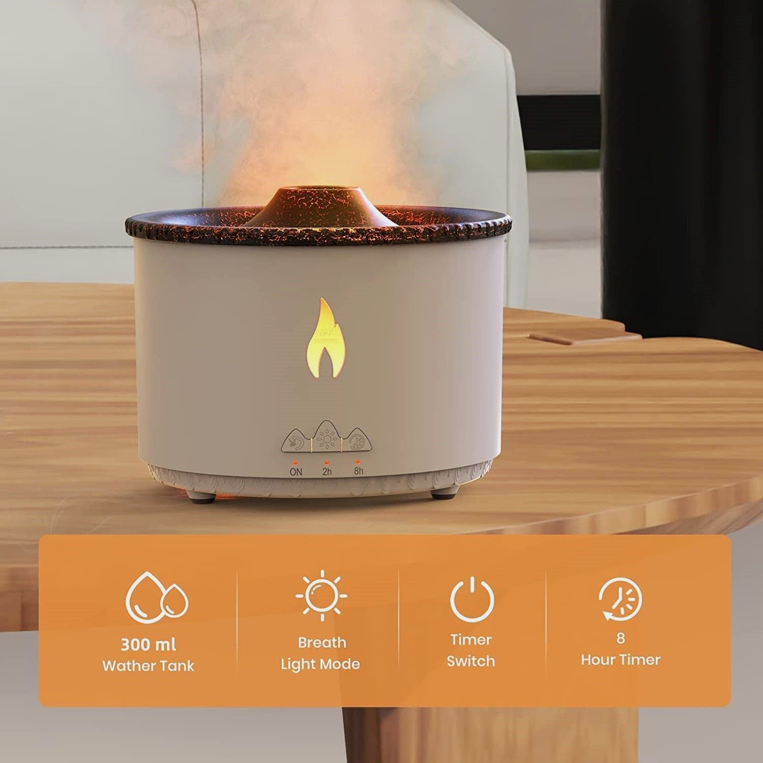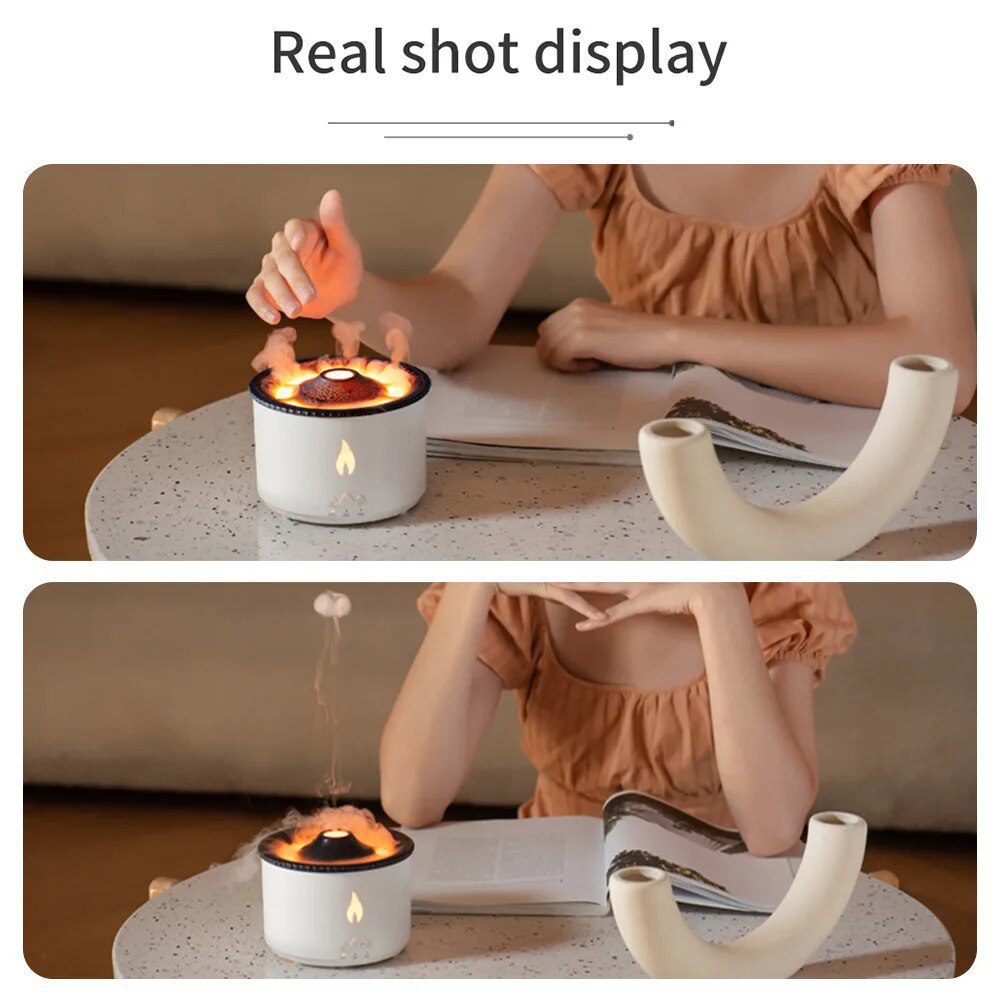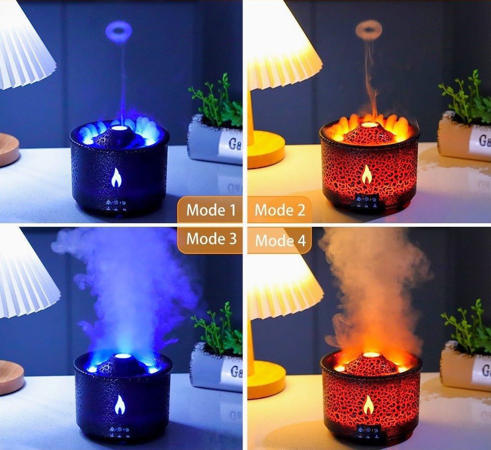 There are two modes, both creating excellent visual effect: volcano mode and flame mode. Volcano mode ejects smoke like a jellyfish, while flame mode uses LED lights to simulate the flame effect.