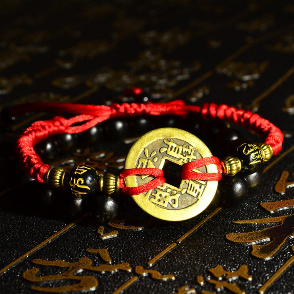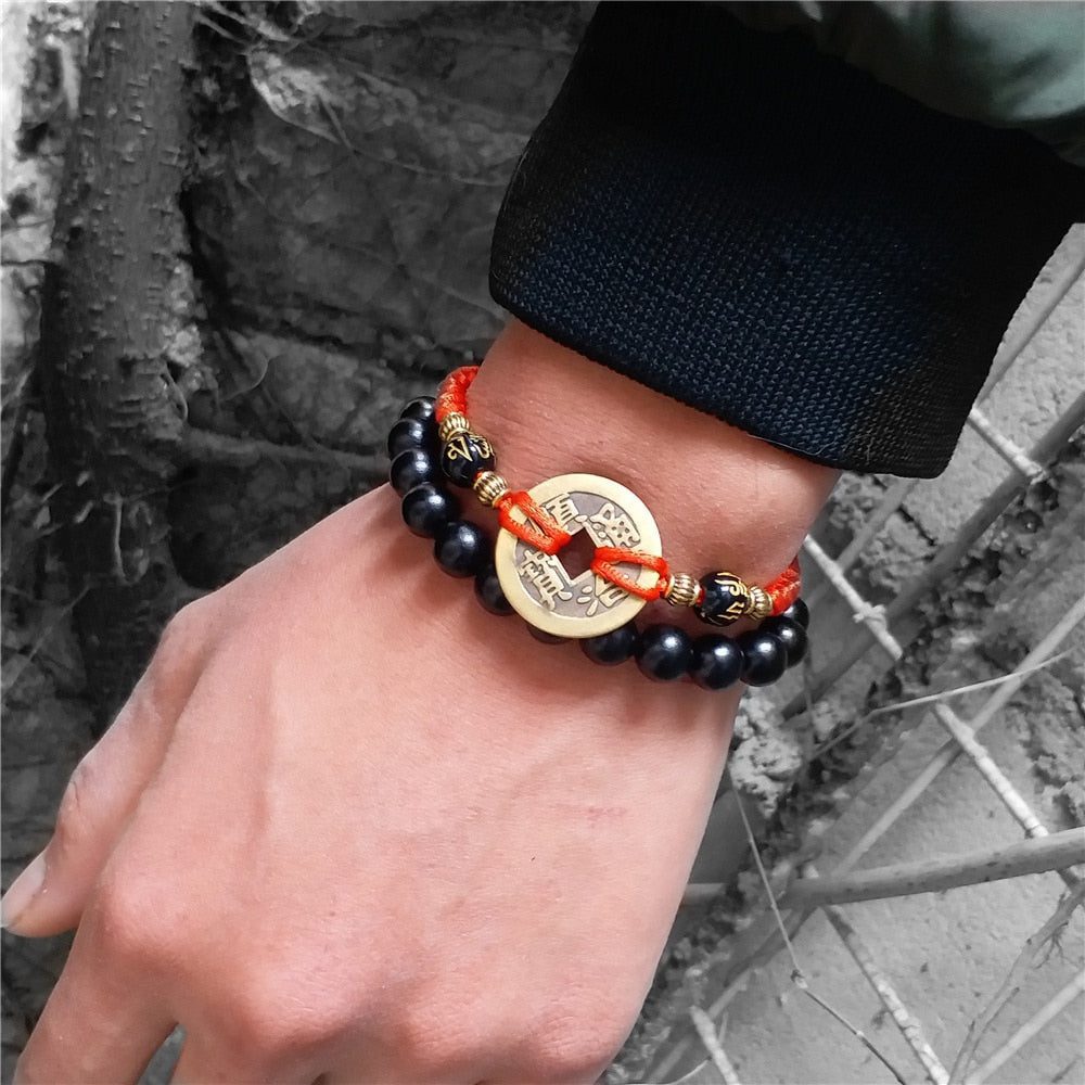 It comprises the exemplary look of the wooden bracelet and adds to the elements of earth and metal. Each bead is stained in a profound, glossy,jet black finish and has an engraved six-syllable mantra. It also has a red knot rope that is believed to attract positive energy and the copper coin to get more luck.