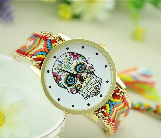 The face of this unique time piece has a beautiful and colorful sugar skull in the center to complete the look. The strap is made of hand woven threads in a classic friendship bracelet style cleverly set with a gold chain at each side giving it a very alluring finish. The gold chain also protects the woven threads from pulling or stretching and gives it a touch of elegance.