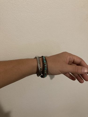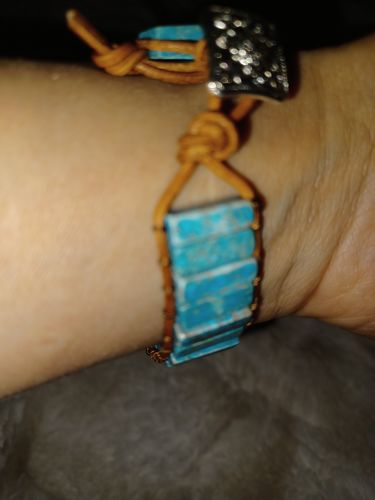 Rectangular turquoise pieces lined up to form a cute bracelet. Glad to have it .
