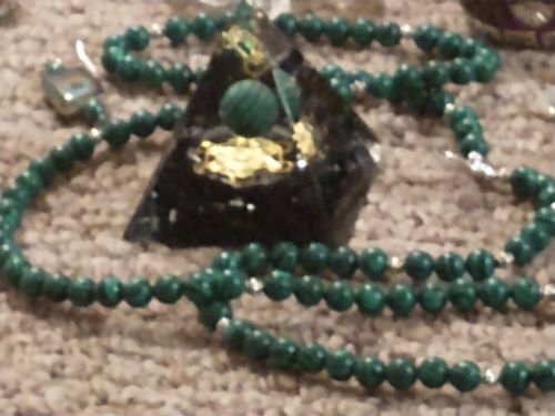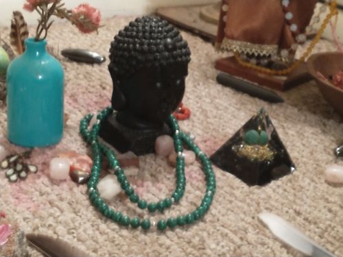 The Malachite Mala adorns the Buddha on my altar. Beside the Buddha is the beautiful Orgone Pyramid with its Geometric shapes inside the pyramid. I love them both.