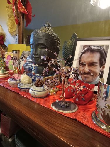 My son passed away in Aug. We scattered his ashes on a beach & claimed a tree which we decorate. The weather hasn’t allowed us to go lately so this represents that.