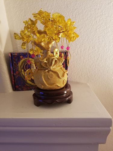 Arrived today and it is beautiful! I will be adding it to my Abundance later. For now it is on display on the mantle. It looks amazing. Love the color and the golden coins make it look grand.!